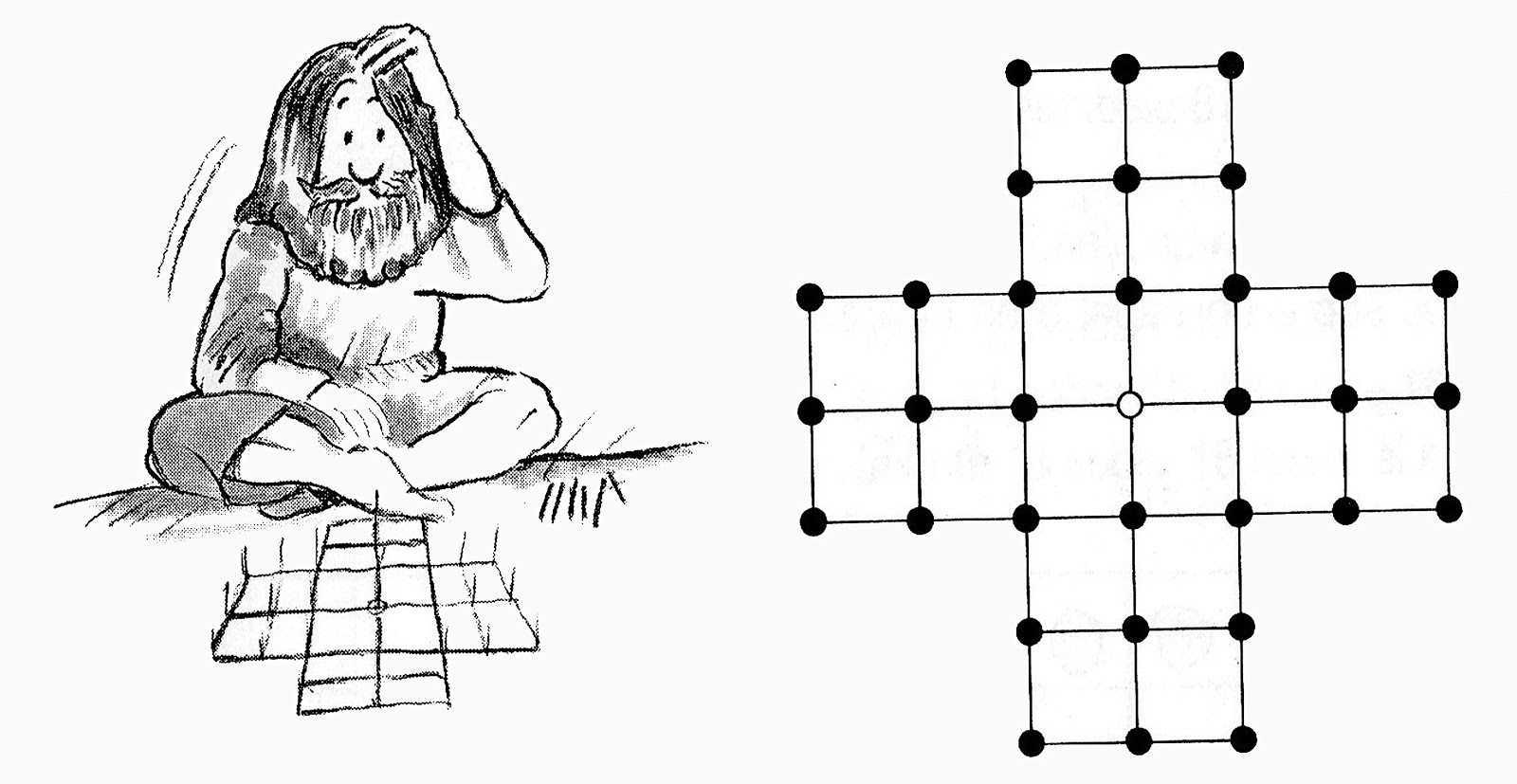El campo de juego tiene 33 agujeros dentro de los cuales se colocan palitos puedes hacerlo en el jardín, en la arena o en un cartón con 7 líneas paralelas horizontales y 7 verticales de modo que se forme un patrón de ajedrez con 33 intersecciones. Todas las intersecciones de las líneas cúbrelas con piedritas, palitos o semillas que el niño colocara en agujeros de cada intersecciones, excepto el punto medio que queda libre. El juego se trata de pasar una piedrita por encima de otra y aterrizar en un punto vacío y se saca la piedrita que fue atravesada. Solo se puede avanzar de forma horizontal o vertical, nunca de forma transversal. Gradualmente se van eliminando piedritas hasta que quede una. Desde el momento que preparan los materiales para jugar inician a pensar lógicamente, espacialmente, controlan sus movimientos, adiestras la psicomotricidad fina, el niño presta atención, piensa diferente y ni cuenta te das que están jugando cuando aprenden.
